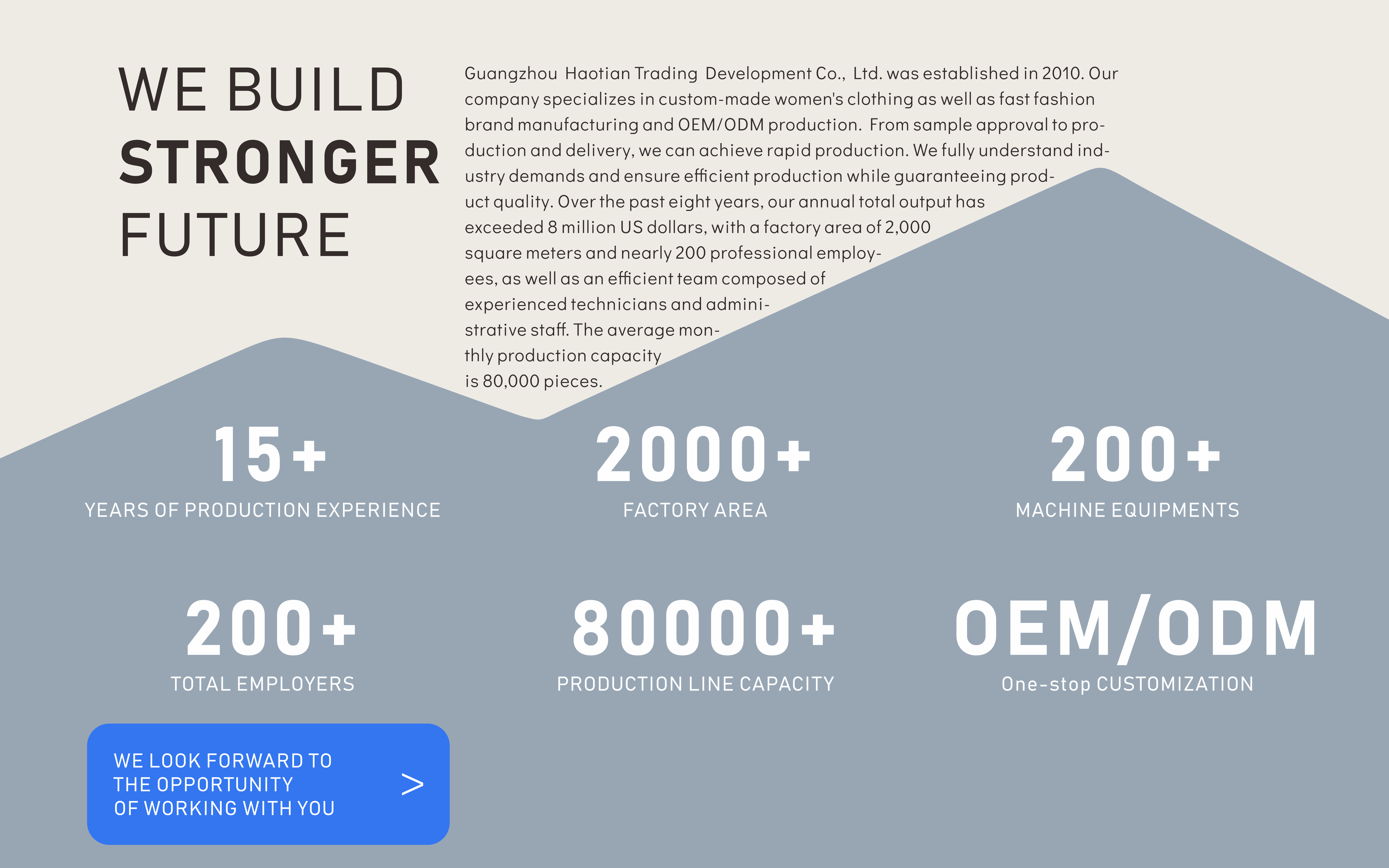 As a modern clothing enterprise integrating R&D, design, production, sales and service, we have been deeply engaged in the industry for many years. We always focus on market demands and integrate global high-quality resources to build a multi-category women’s clothing ecological chain. With efhcient production capacity, innovative design concepts and strict quality management systems, we have served numerous well-known domestic and foreign brands and enterprises , and established long-term and stable cooperative relationships.