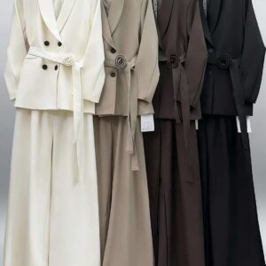 5693 Customize a two-piece women’s outfit, including a jacket with a belt and trousers.