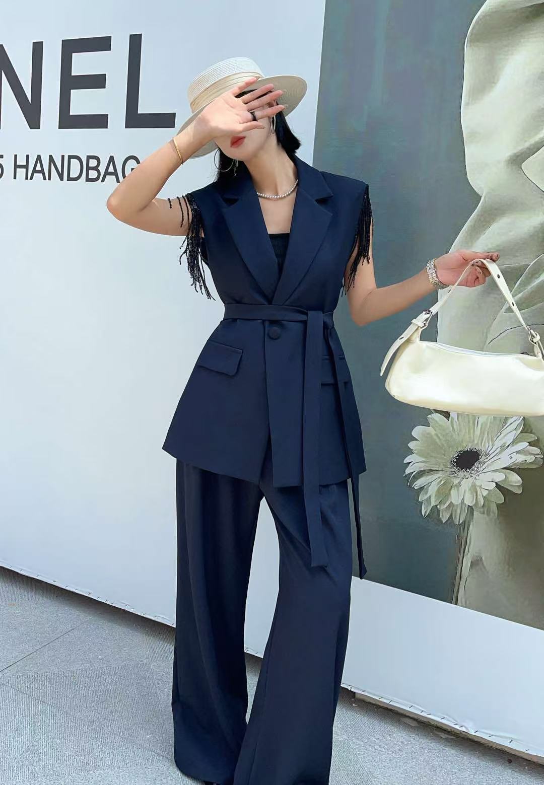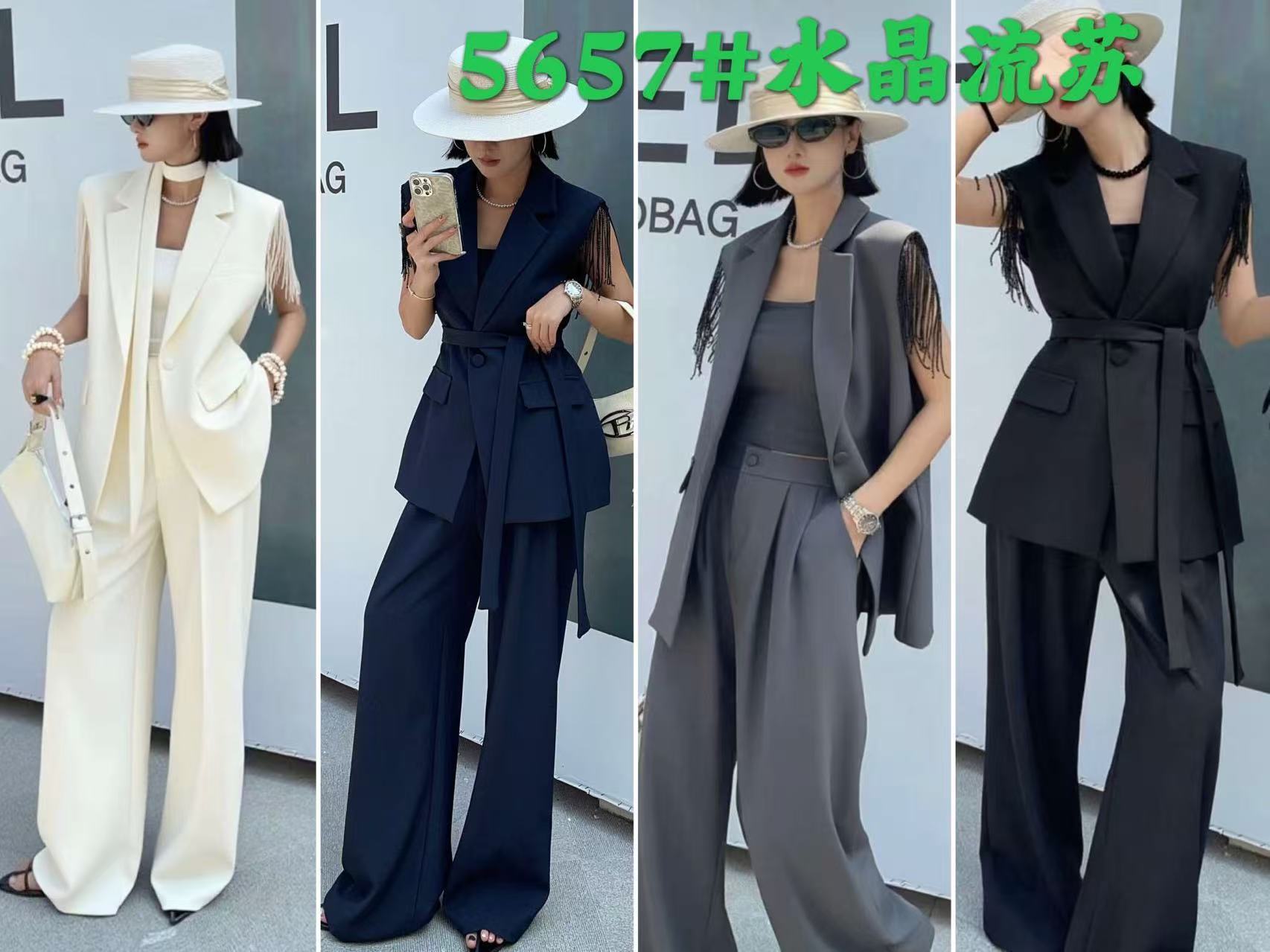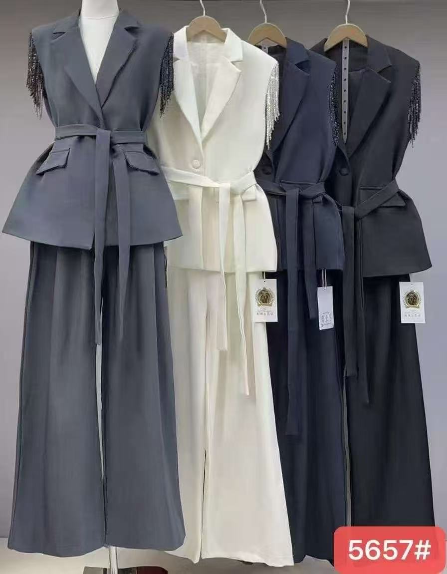 5657 Customized women’s two-piece fabric belt, sleeveless blouse and pants, paired with comfortable lining