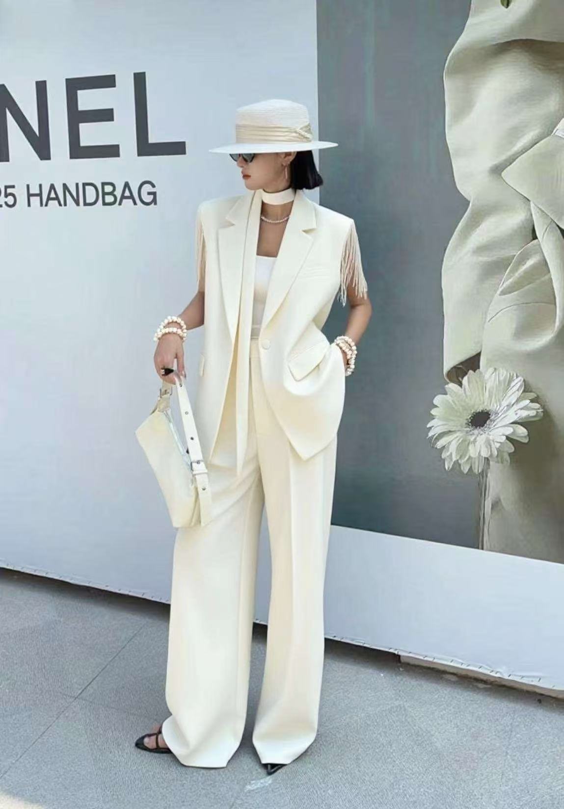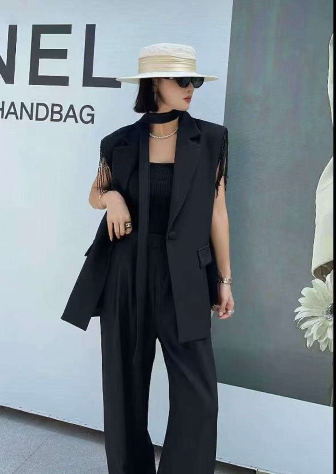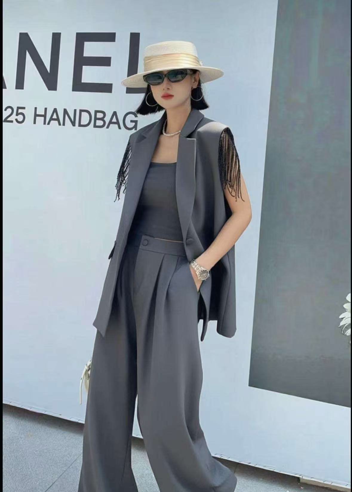 5657 Customized women’s two-piece fabric belt, sleeveless blouse and pants, paired with comfortable lining