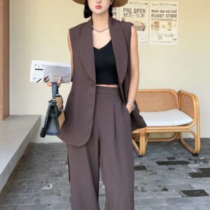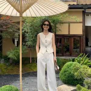 3628 Women’s 2025 Spring New Fashion Rattan Crepe Shirt with Retro Sleeveless Buttoned Casual Women’s Jacket Set