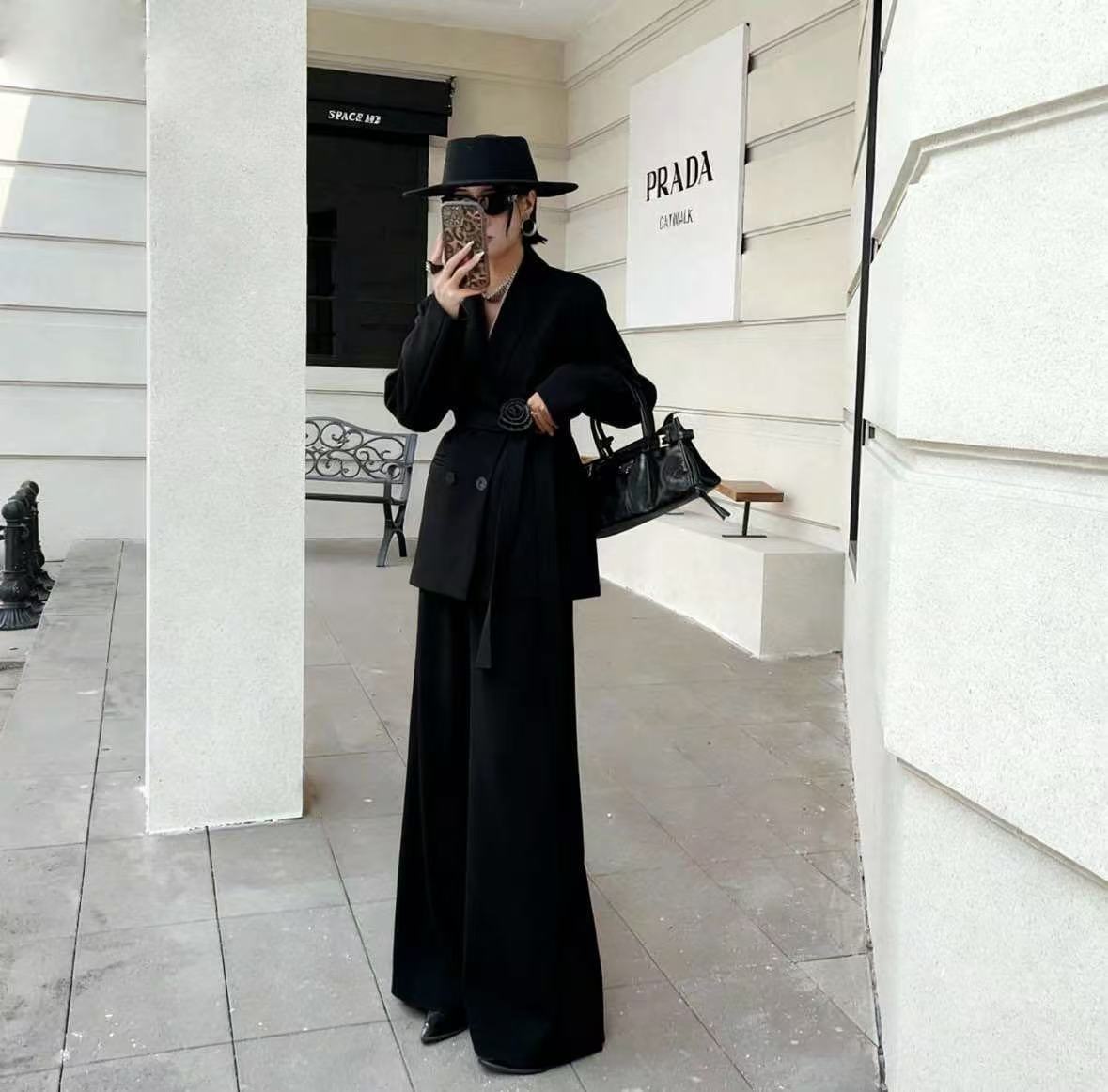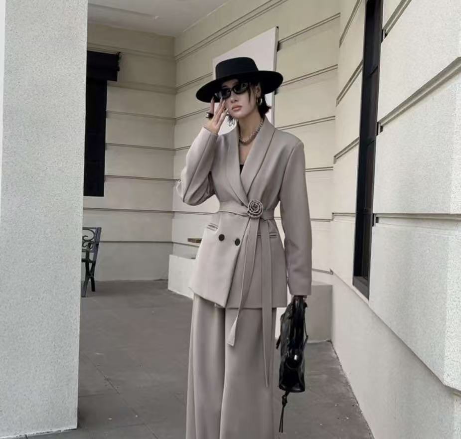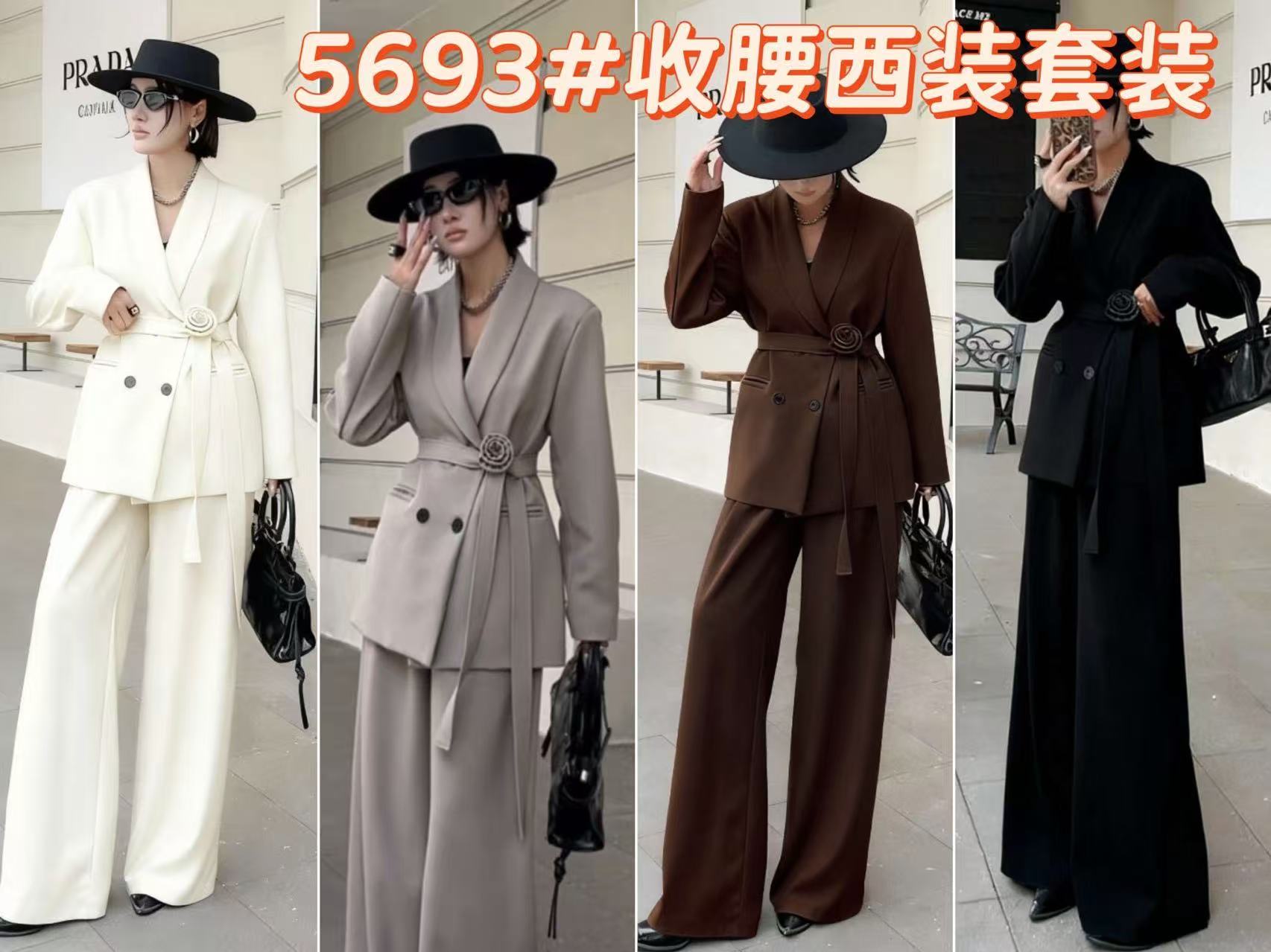 5693 Customize a two-piece women’s outfit, including a jacket with a belt and trousers.