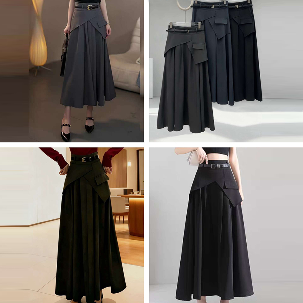 5697 French Elegant Women’s A-line Skirt with Belt – Stylish Fall and Winter Casual Plain Skirt