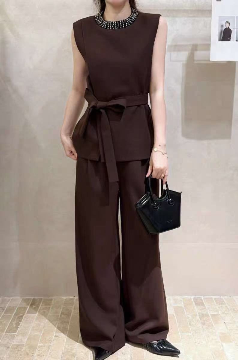 5657 Customized women’s two-piece fabric belt, sleeveless blouse and pants, paired with comfortable lining